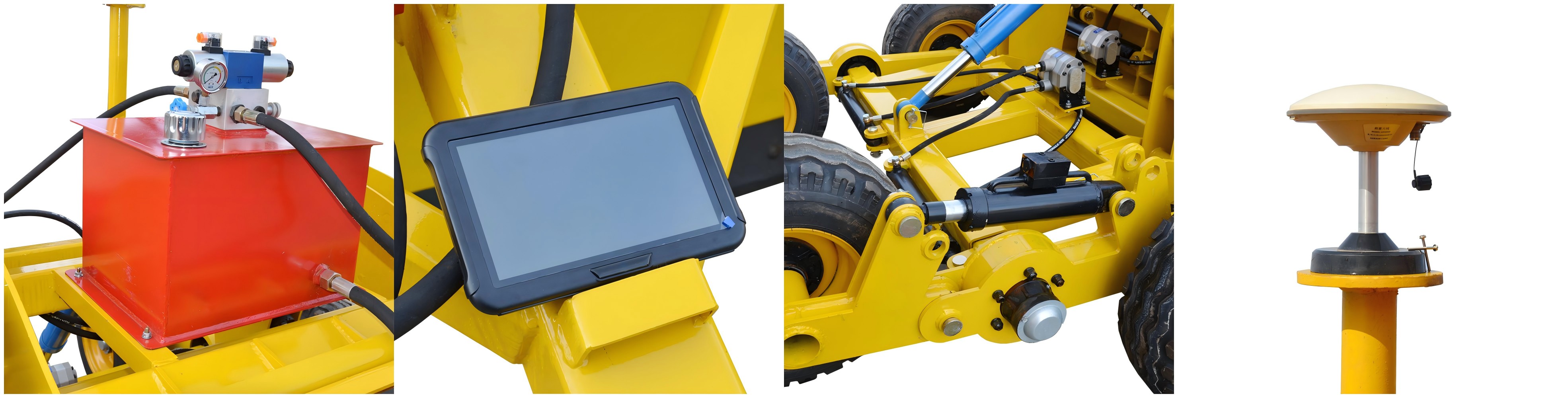 1. 세텔리트베이스 스테이션 : 삼각대에 장착 된이 구성 요소는 Beidou 또는 GPS 신호가 필드의 기계에 대한 실제 높이를 찾을 수 있도록합니다. 2. Satellite 수신기 :이 전 방향 수신기는 제어 상자에 대한 높이 위치 신호의 위치를 감지합니다. 드래그 버킷에 부착 된 수동/유압 마스트에 장착됩니다. 3. 제어 패널 :이 상자는 위성 수신기의 신호를 받아들이고 프로세스를 수용하여 완성 된 등급에 비해 드래그 버킷의 위치를 표시합니다. 컨트롤 박스에는 켜기/끄기, 자동/수동 및 수동 상승/하단의 세 가지 스위치가 있으며 자동으로 설정할 때 유압 밸브를 구동하기위한 전기 출력을 제공합니다. 4. 유수 제어 시스템 : 트랙터의 유압 시스템은 오일을 공급하여 레벨링 버킷을 높이고 낮추는 것입니다. 압력 릴리프 밸브는 과도한 오일을 트랙터 저수지로 반환합니다. 솔레노이드 제어 밸브는 유압 램으로의 오일 흐름을 제어하여 버킷을 높이고 낮추는다. 5. 드래그 버킷 : 레벨링 버킷은 트랙터와 장착 된 3 점 링키지 일 수 있습니다. 높은 지역에서 토양을 퍼 내고 낮은 지역에 쌓는 데 사용됩니다. 절단 블레이드는 1-2cm (1-2cm) 이상으로 설정됩니다.